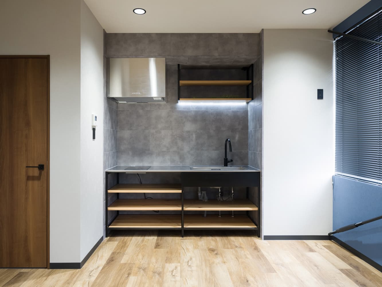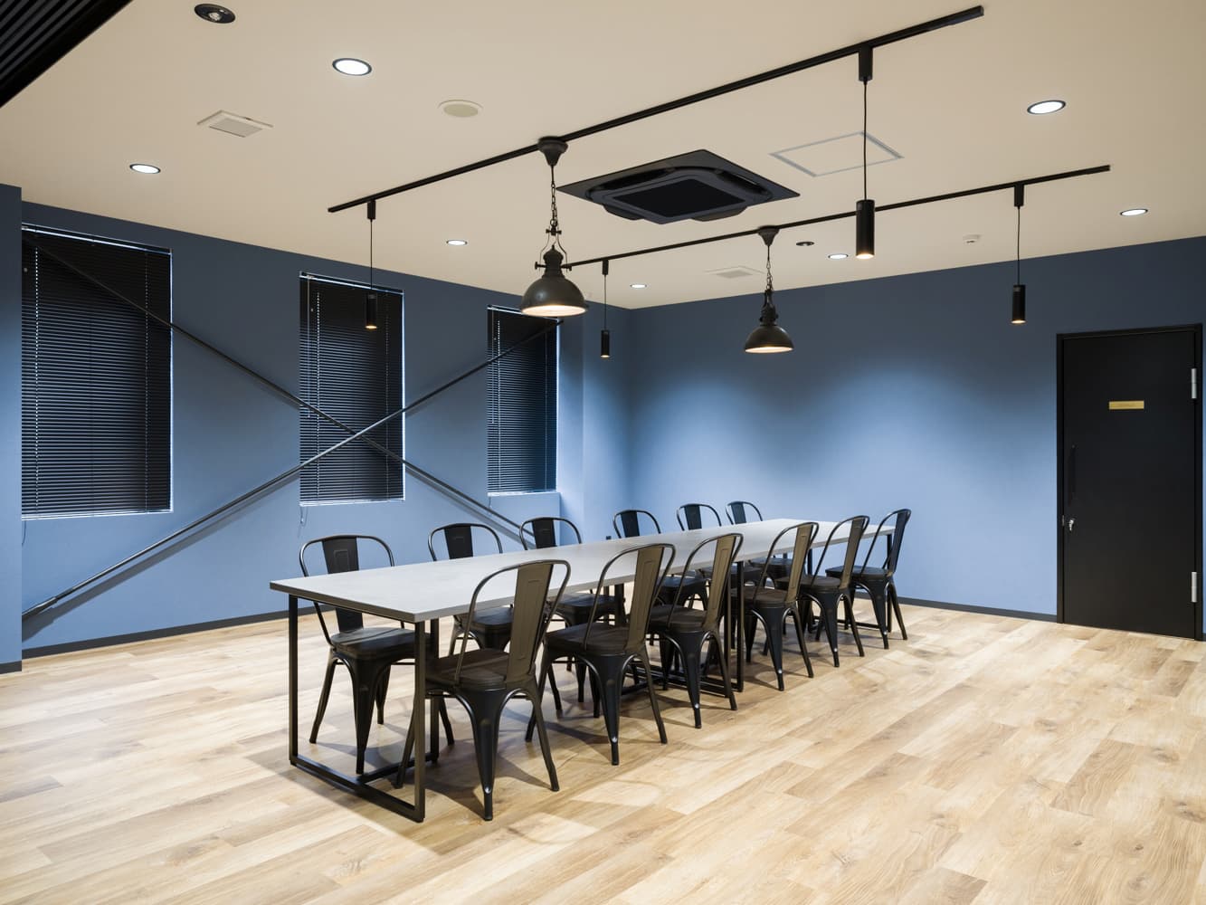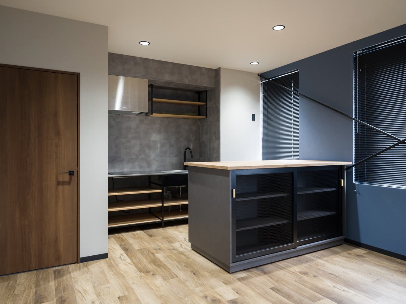 落ち着きのあるブルーの壁紙をメインカラーとし、インダストリアル調の家具でコーディネートしています。