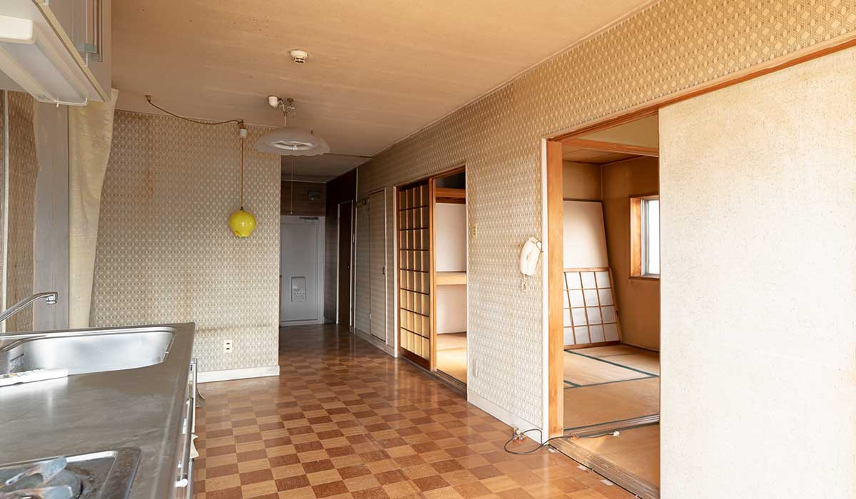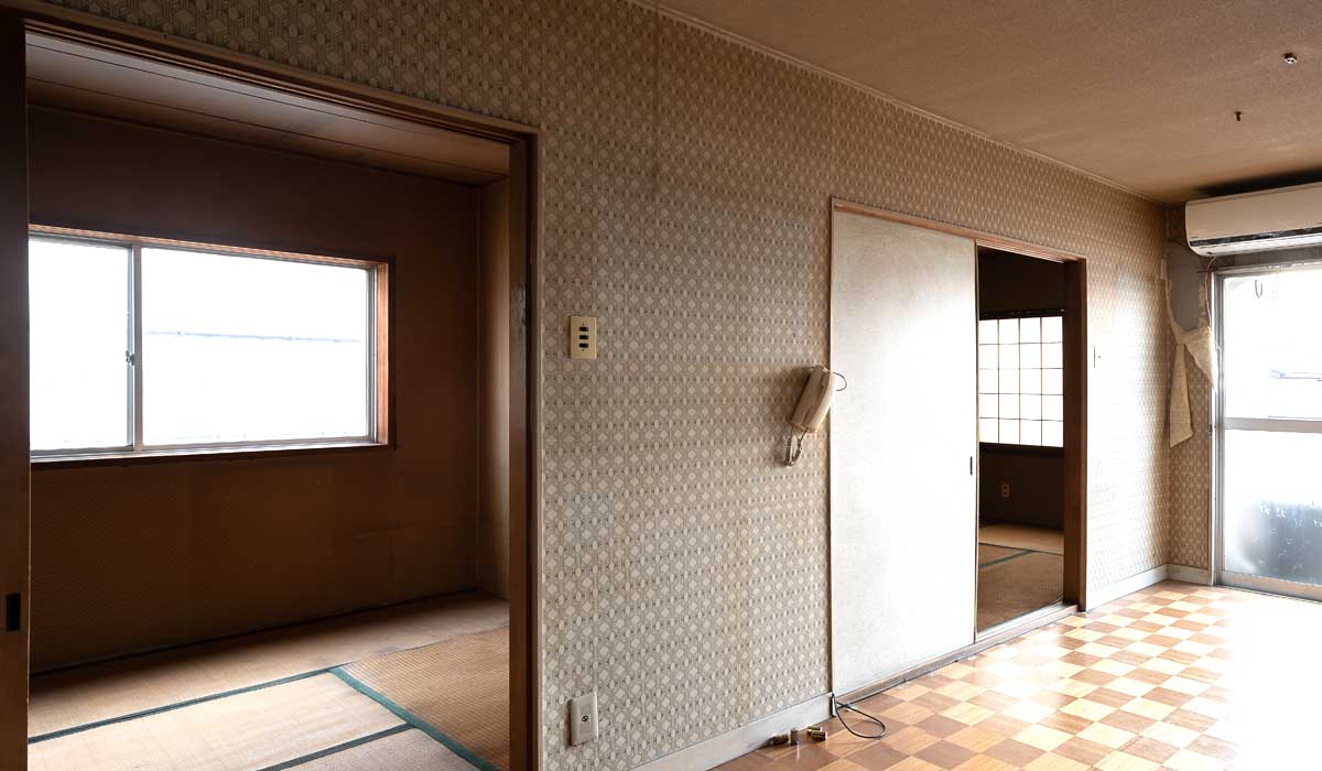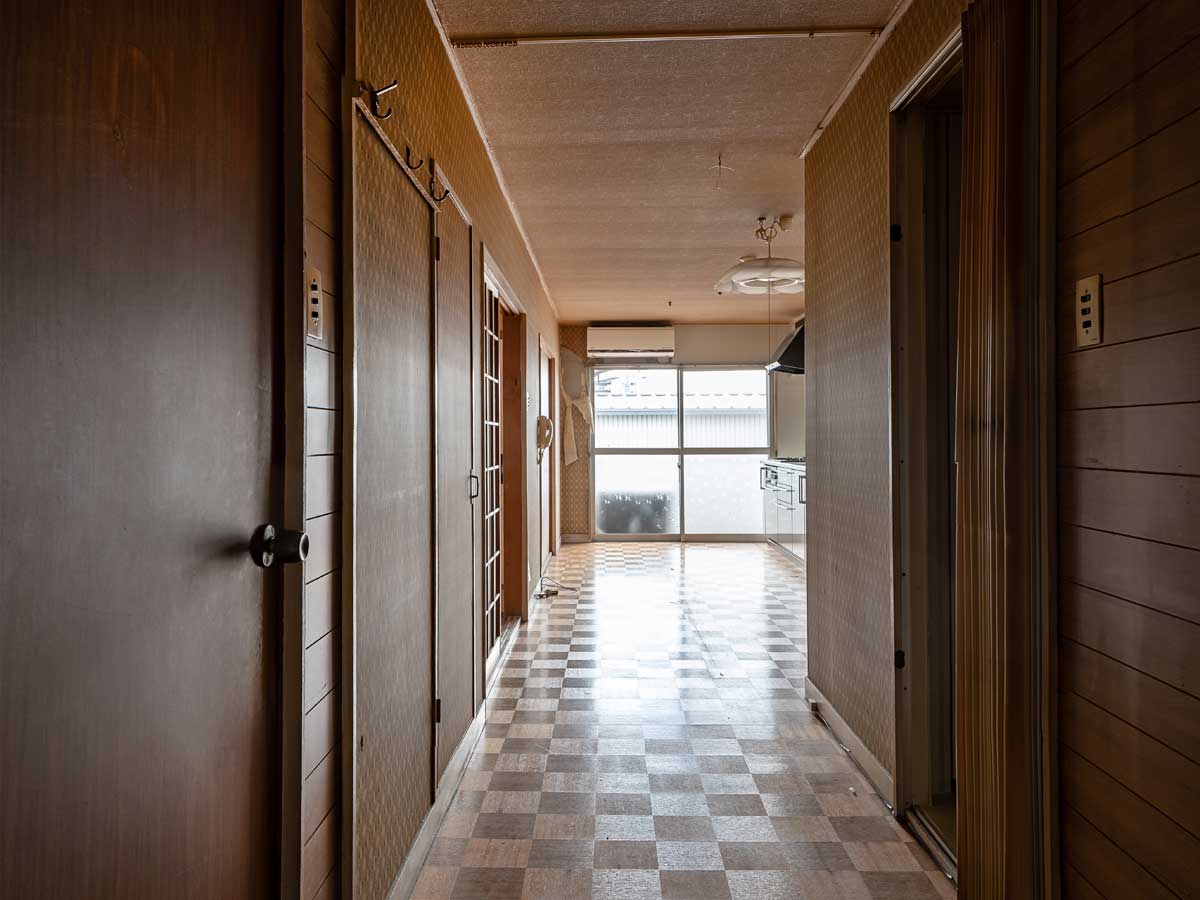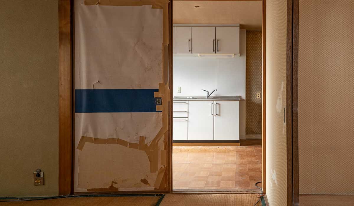 継ハギだらけのふすまから覗く、白いキッチンが悲しげなコントラスト。