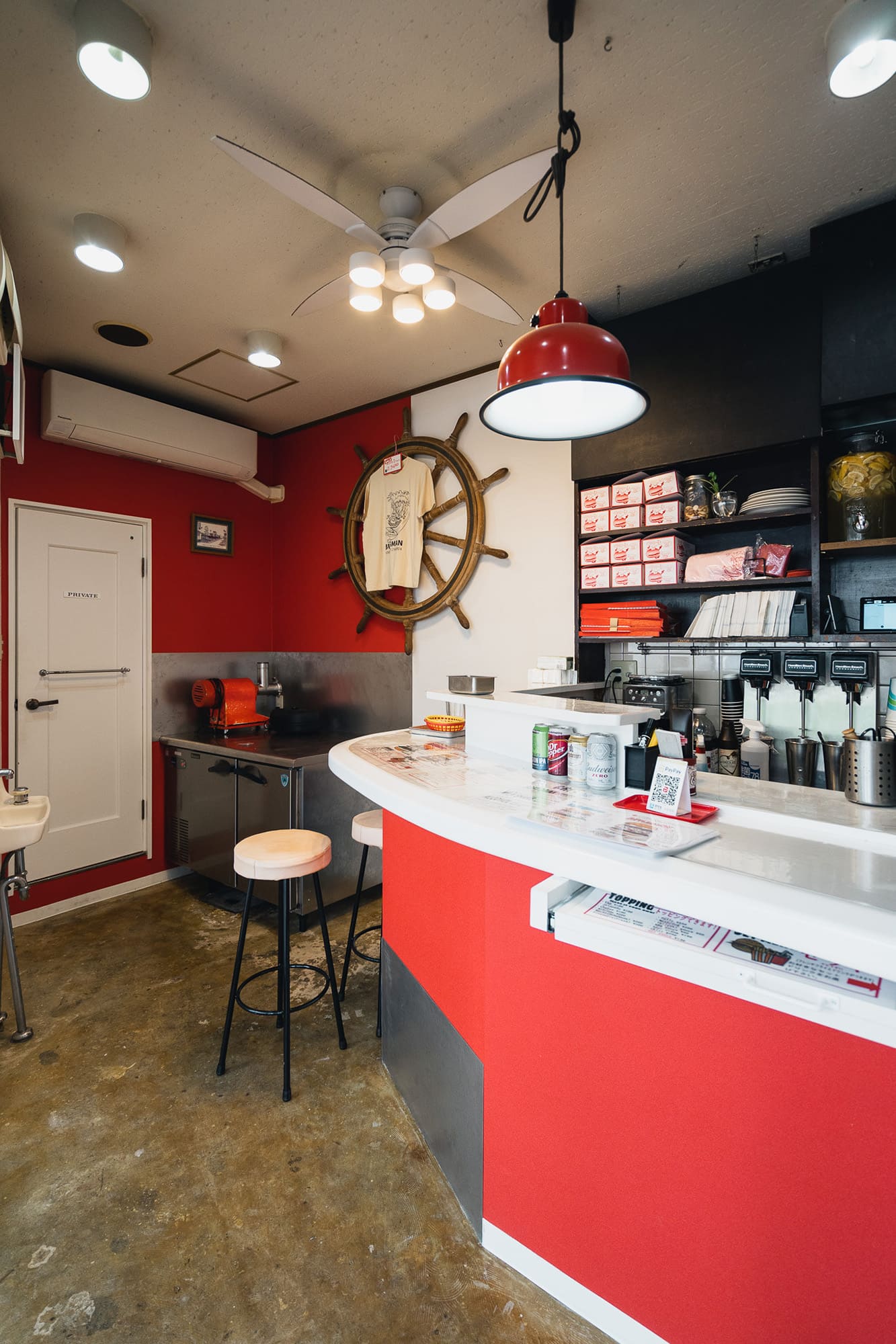 お店のイメージカラーである赤と白をベースとした、アメリカンなハンバーガーショップ。