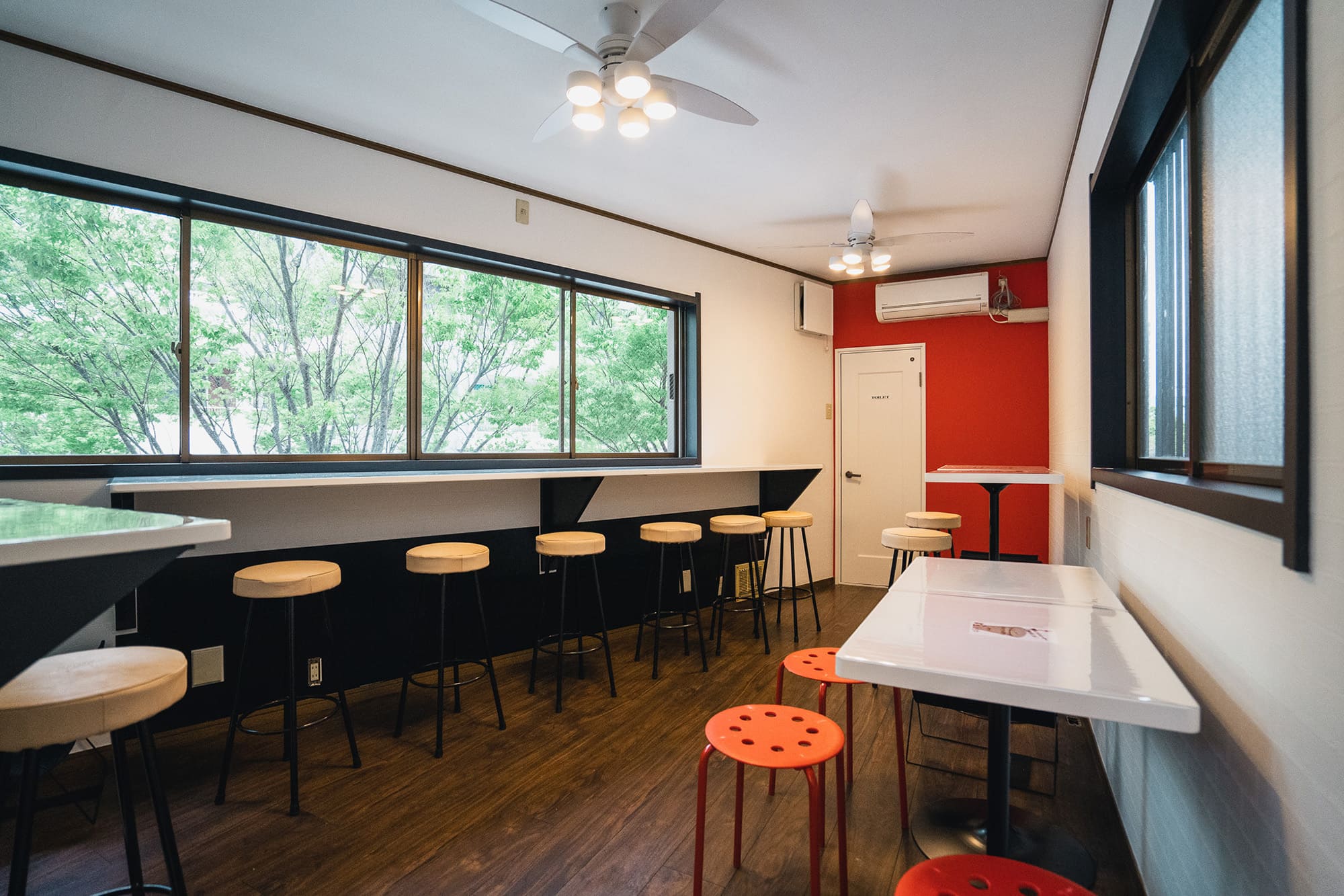 2Fのイートインスペースにも、イメージカラーの赤をアクセントで取り入れました。シーリングファンも雰囲気にマッチしています。