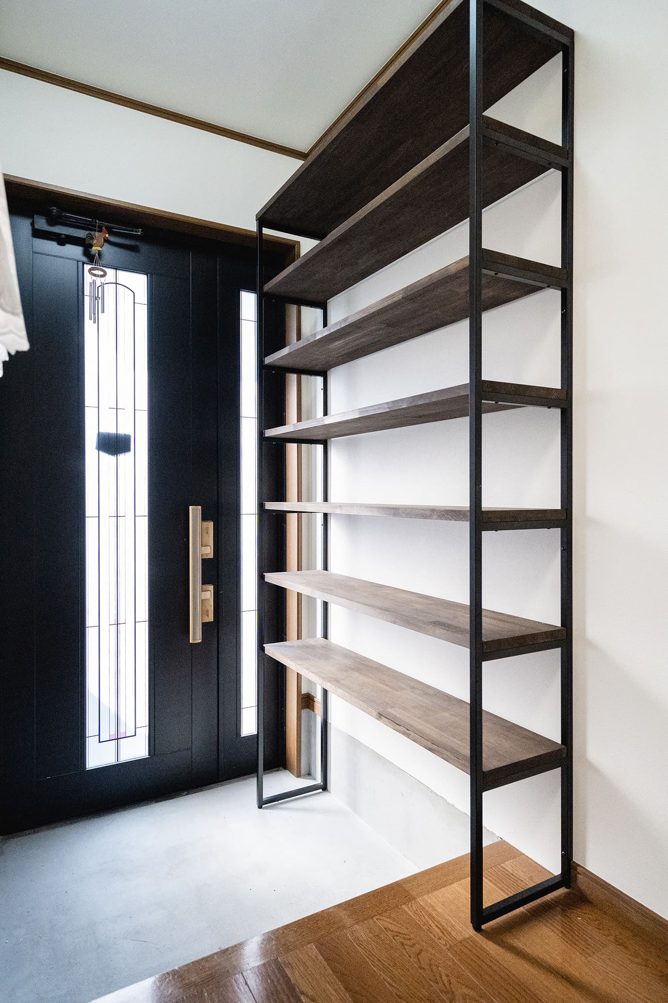 使用用途に合わせて、サイズぴったりにオーダー制作したアイアンシェルフ。木の風合いにもこだわりました。