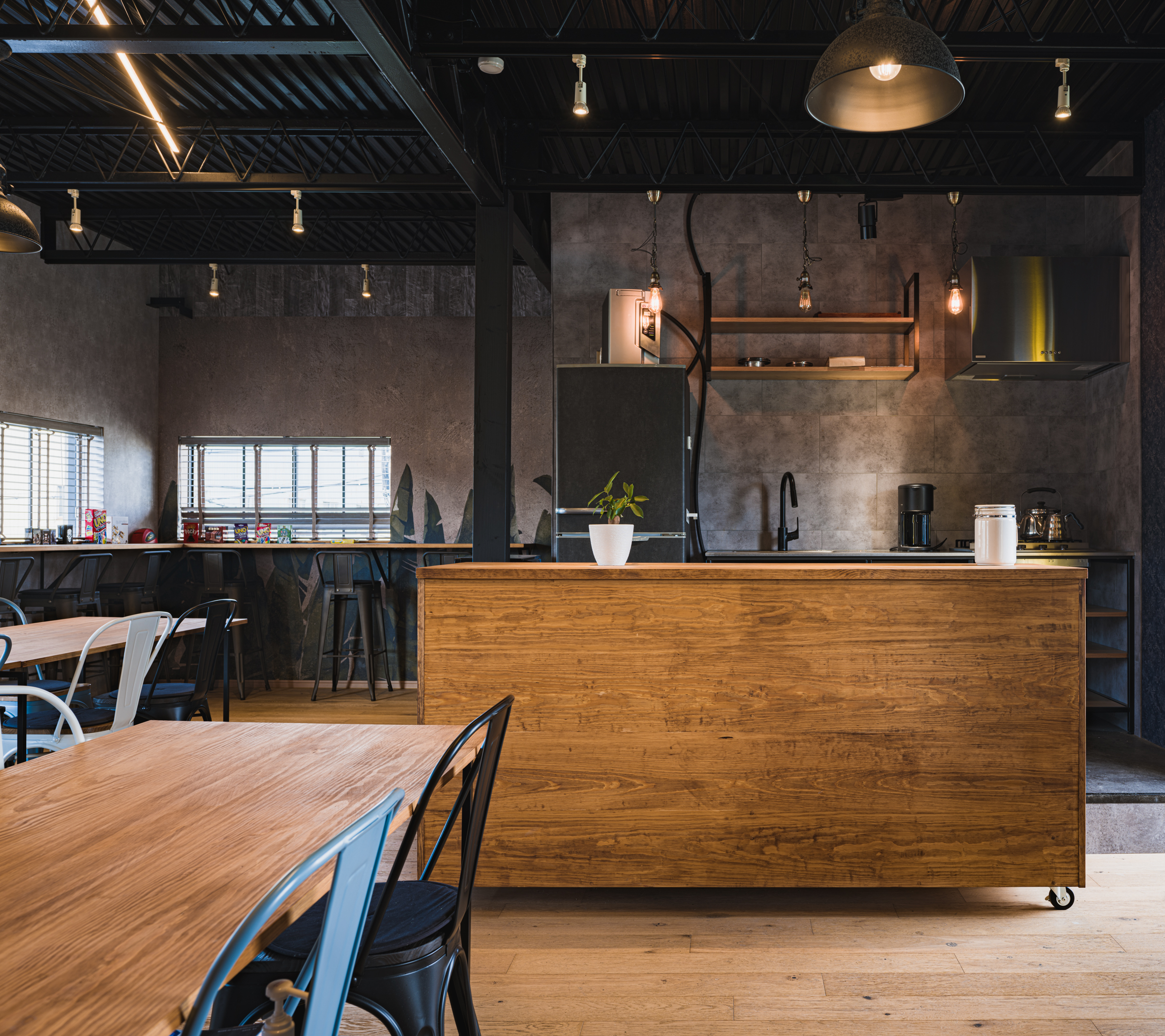 以前小さな作業台で静かなお昼休憩の時間でしたが、リノベーションしたことで社員の方皆さんが集まる活気のある空間に。